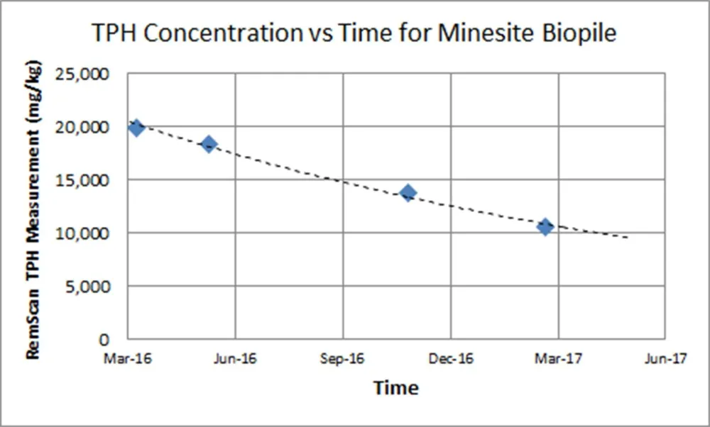 • Monitoring of the remediation process in the biofarm to optimisation the process and throughput. Nutrients and water are added and the soil is aerated to stimulate natural microorganisms to degrade the hydrocarbons. The Fortescue team uses RemScan to monitor the concentration of the hydrocarbons over time (refer graph) to ascertain the endpoint when laboratory analysis is use to validate the results so that soil can be reused in the operations.