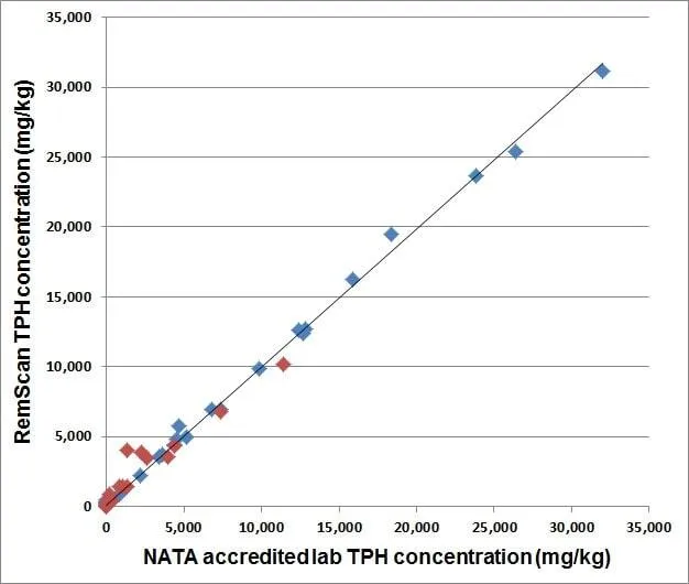 To independently verify the instrument’s performance, 19 ‘blind’ soil samples were sent to a NATA-accredited laboratory for analysis. A very close correlation was observed between the TPH values predicted by RemScan and the laboratory data with an R2 value of 0.997.